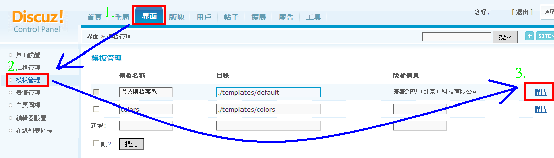 感謝教學, 但是我左邊沒有模板選項, 如果用搜尋模板的方法找到頁面, 進去會說"您沒有權限訪問系統設置。"